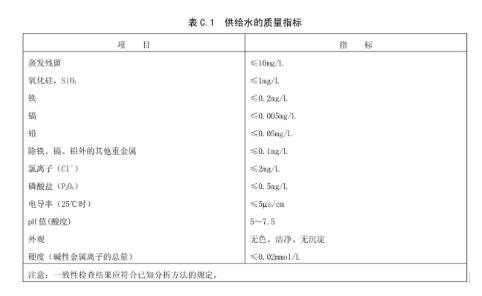除了硬度要求,滅菌器的進水還對其他指標有較高的要求,比如水中鐵,pH值、鎘、鉛等重金屬雜質。國標《GB 8599-2008大型蒸汽滅菌器技術要求自動控制型》對滅菌器的進水指標做出了規定。要求進水電導率不超過5 μS/cm,二氧化硅含量不超過1㎎/L,硬度要求不超過0.02 mol/L,還對鐵、鎘、鉛、氯離子、磷酸鹽、pH、重金屬離子等做出了詳細的規定(如下圖所示)。