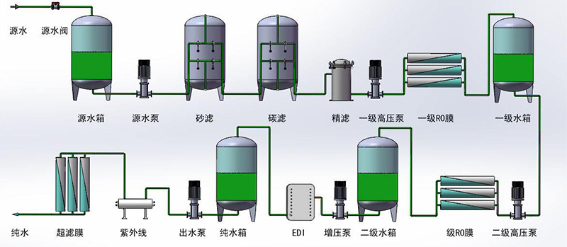 圖二所示是比較高端的超純水機,較圖一增加了雙級反滲透、EDI模塊、紫外光、超濾膜等配件,出水品質在所有設備正常的情況下,可以保證18.2的超純水品質。