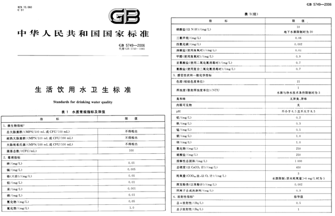 其中GB5749-2006《生活飲用水衛生標準》對于居民生活飲用水的106項指標要求中就有砷和氟的要求,要求砷含量<0.01mg/L,氟含量<1.0mg/L,這樣做的目的就是為了防止砷和氟超標導致出現飲水型砷中毒和飲水型氟中毒。
