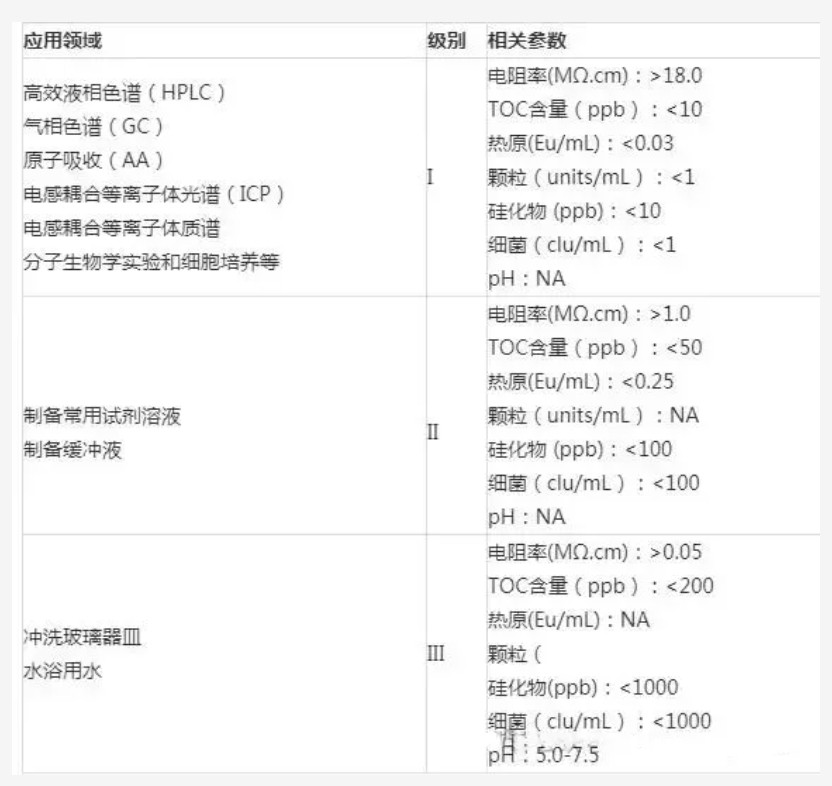 實驗室純水應為無色透明的液體,不得有肉眼可辨的顏色或纖絮雜質。國家實驗室純水標準GB/T6682-2008標準,將純水水質分類主要分三類,如下: