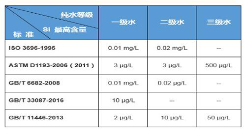 目前比較通用的純水標準包括ISO 3696-1995、ASTM D1193-2011、GB6682-2008、GB/T33087-2016、GB/T11446-2013。這些標準除了對Na+、Cl- 離子的含量有明確規定外,還規定了硅含量的要求。