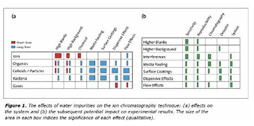 在分析痕量水平的樣品時,確保所供數據可信的WY方法是擁有可靠的IC儀器、高質量的試劑和純水。水可以用于IC的多種方面,包括樣品稀釋、樣品制備或預處理、制備空白樣和標準樣、沖洗設備和作為洗脫液。在無試劑離子色譜(RFIC)系統中,WY存在的流動相是純水。因此,水中存在的任何雜質都會以多種方式干擾分析,可靠的未受污染水源對于重現結果至關重要。