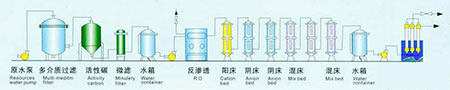 原水→原水箱→原水泵→多介質過濾器→活性碳過濾器→軟化器→一級精密過濾器→一級反滲透→二級反滲透→臭氧發生器→純化水箱→紫外殺菌器→純水泵→用水點。