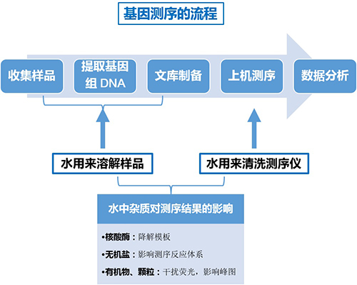 整個測序環節中,從樣品收集到上機測序,水貫穿了包括測序儀的日常清洗維護和試劑配制在內的每一個環節。作為一個必不可少的基礎試劑,水的品質對最終測序結果會產生顯著影響。水中的雜質,如無機鹽、有機物、核酸酶、顆粒物等,不僅會污染設備,縮短測序儀毛細管的使用壽命,而且還會降低DNA聚合酶的活性,最終干擾測序結果的準確性。