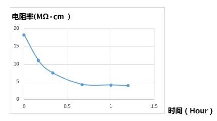 當超純水開始曝露在大氣下時,二氧化碳的溶解就會無可避免的持續下去,我們可以用電阻率的變化來監測這個過程。實踐證明15MΩ.cm以上的超純水暴露在空氣中1個小時后水質就會下降至4MΩ.cm左右。